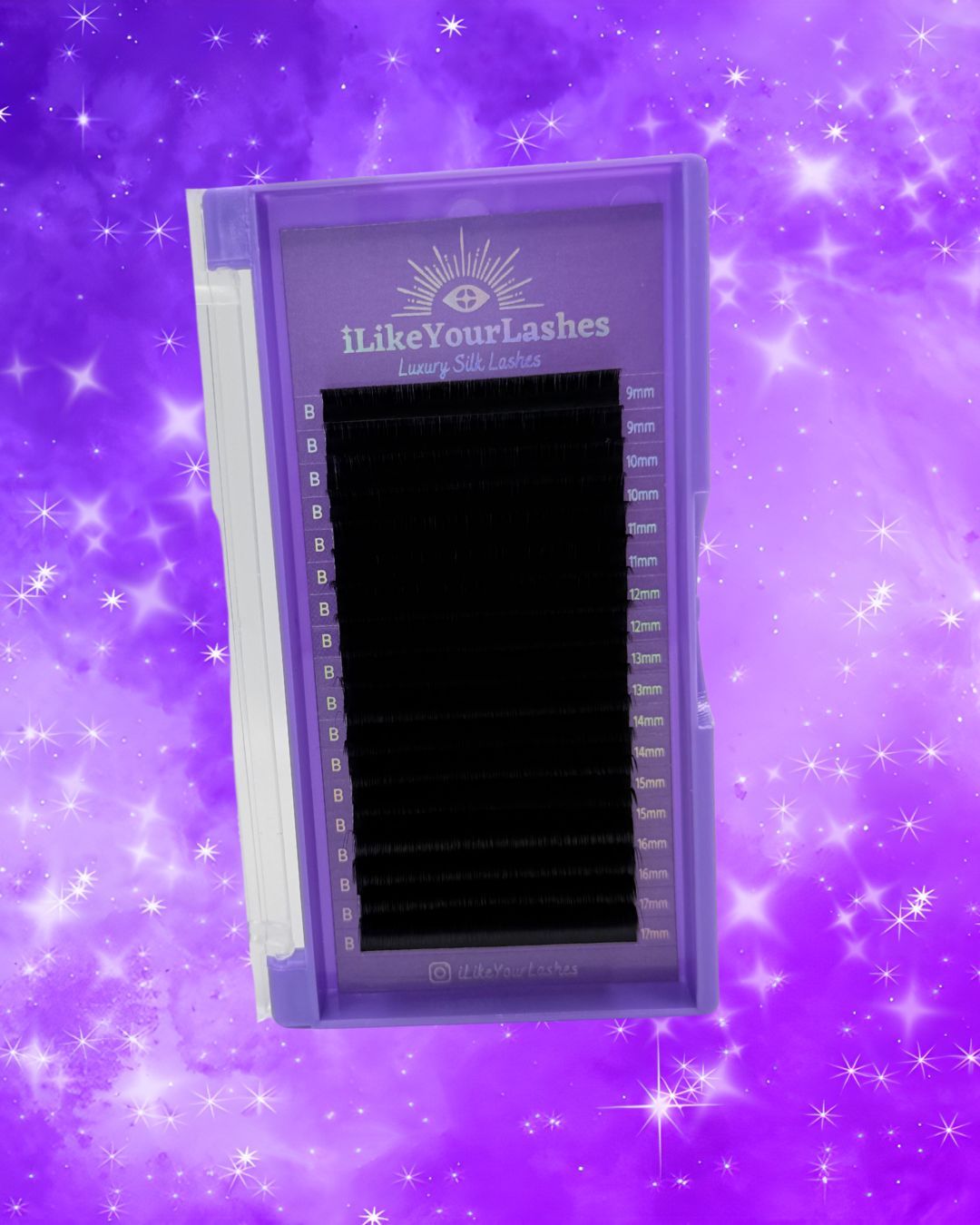 Ultra-dark B curl trays in a rich matte black finish with no blue tint. Designed for smooth pickup and precise 1:1 application, these lashes provide a natural enhancement in lengths 9–17 mm.